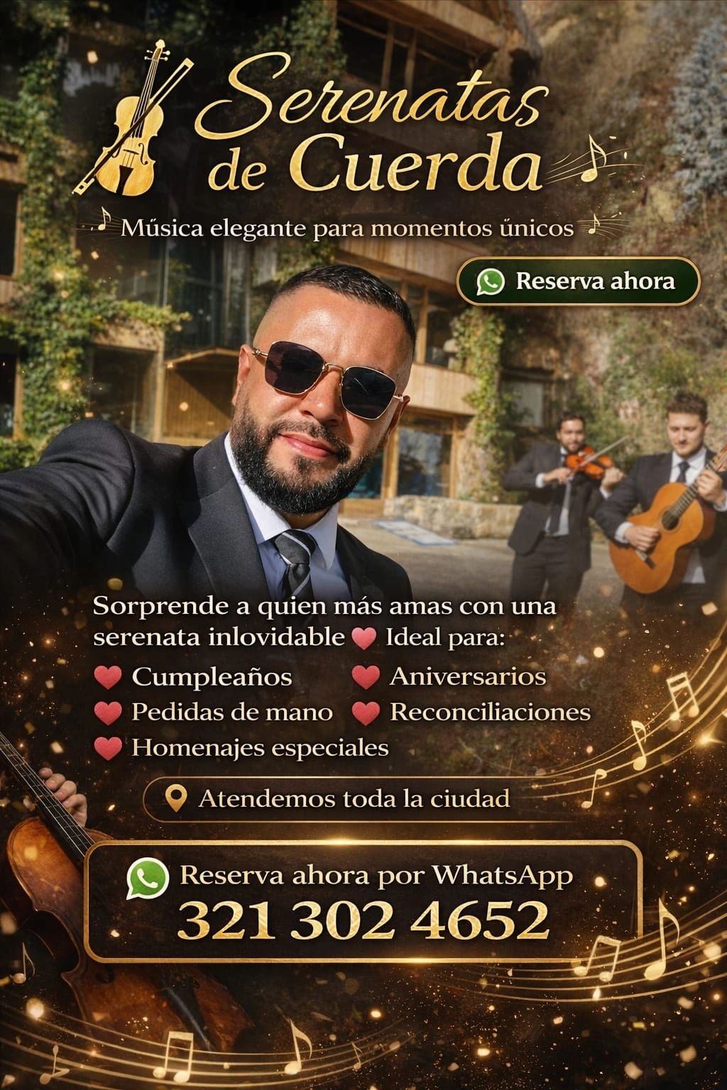 Sorprende a esa persona especial con una serenata romántica a domicilio en Bogotá. Nuestro repertorio de serenatas incluye los temas más hermosos para cumpleaños, aniversarios, pedidas de mano y celebraciones especiales. Música en vivo que emociona corazones y crea recuerdos eternos. trios musicales trío musical en bogotá serenatas de cuerda“Más de 300 serenatas realizadas”